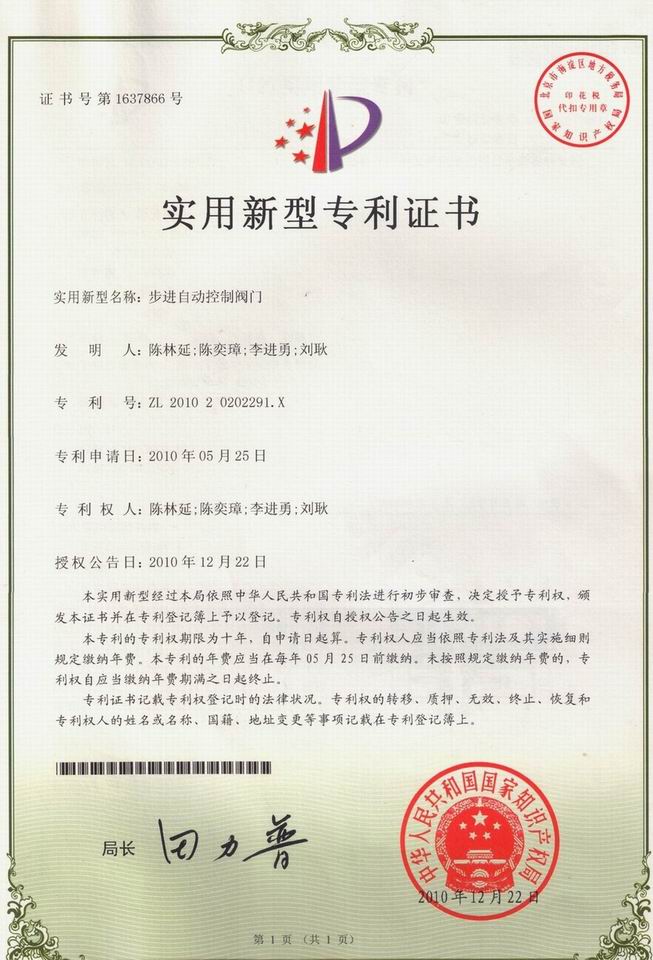 步進(jìn)自動控制閥門,專利號:ZL 2010 2 0202291.X