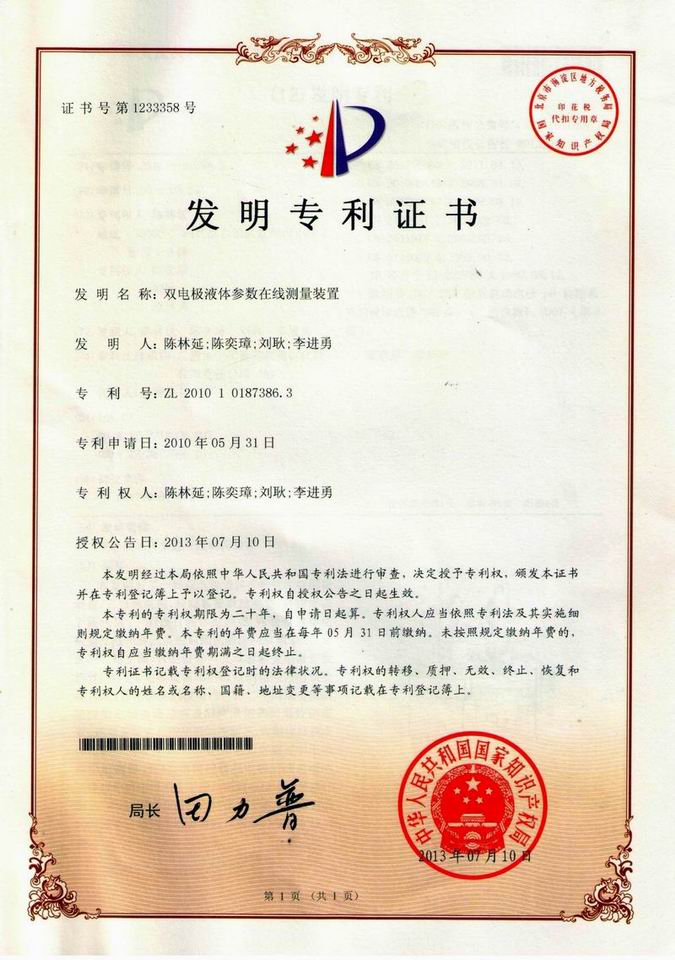 本發(fā)明的目的是提供一個雙電極液體多參數(shù)在線測量裝置,結構簡單,工作可靠和使用方便,能同時檢測多個液體的相關參數(shù),自動清洗電極表面,提高檢測精度。我司著重加大對科研的投入力度,積極開展技術創(chuàng)新工作,通過多年來的努力,公司獲得國家專利授權多項,其中發(fā)明專利2項,實用新型專利4項,在審的發(fā)明專利3項。